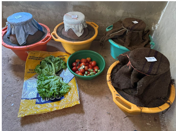 During these training sessions, the communities were not just shown how to assemble the structures; they were presented with a compelling live comparison. The teams displayed tomatoes and aubergines that had been transported across the country in a vehicle, half stored in a clay pot cooler and half in a traditional open basket. The difference was visible to the naked eye: while the produce in the open basket was wilting, bruised from travel, and showing clear signs of spoilage, the produce from the clay pot remained relatively plump and fresh.